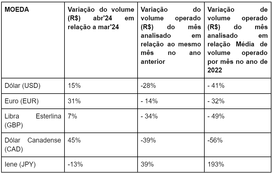 Completando o ranking das cinco moedas mais transacionadas em abril de 2024, a libra esterlina ficou em terceiro lugar, com um aumento de 7% no volume de transações em relação a março, enquanto o dólar canadense subiu para a quarta colocação, com alta de 45% no volume operado em relação ao mês passado.