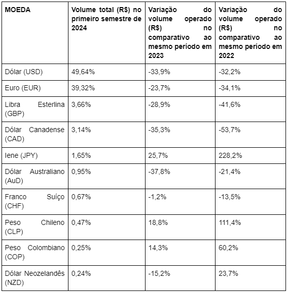 A cotação do dólar norte-americano, que permaneceu abaixo de R$5,00 nos dois fechamentos semestrais de 2023, favoreceu o turismo, um dos segmentos que mais concentram operações cambiais. No entanto, em 2024, a moeda ultrapassou a barreira dos R$5,00 no início de março, mantendo-se em níveis elevados até o final do semestre.