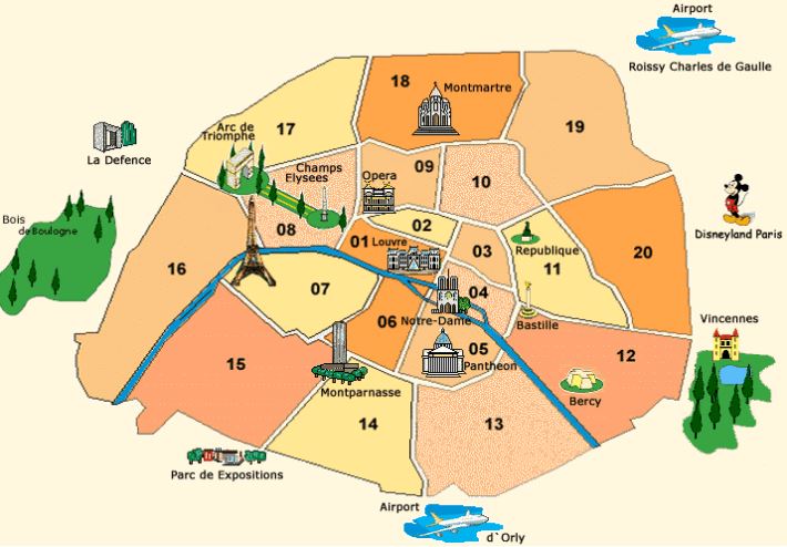 Paris é segmentada de forma bastante incomum: são 20 divisões administrativas (os arrondissements), em formato de espiral. Esse caracol (“escargot”, em francês) é numerado a partir do centro – o 1º arrondissement concentra atrações como a Île de la Cité, onde a cidade nasceu, o Museu do Louvre e o Jardin des Tuileries. O bairro boêmio de Montmartre fica no 18º arrondissement, enquanto o Campo de Marte, onde encontramos a Torre Eiffel, está no 7º.