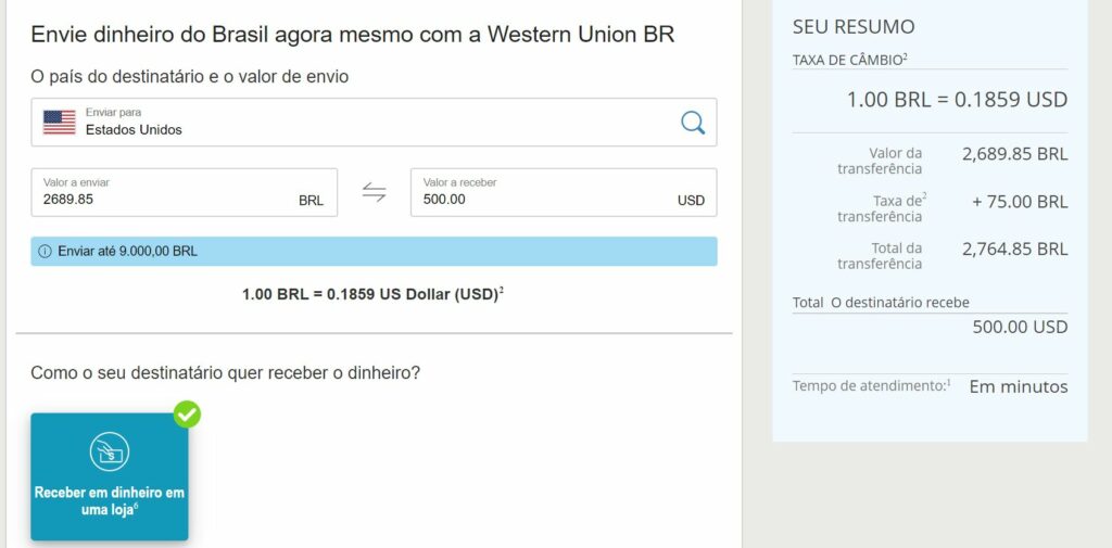 Com a Western Union é possível transferir dinheiro para outra pessoa física residente no exterior até o limite de USD 3 mil por operação, sem valor mínimo descrito.