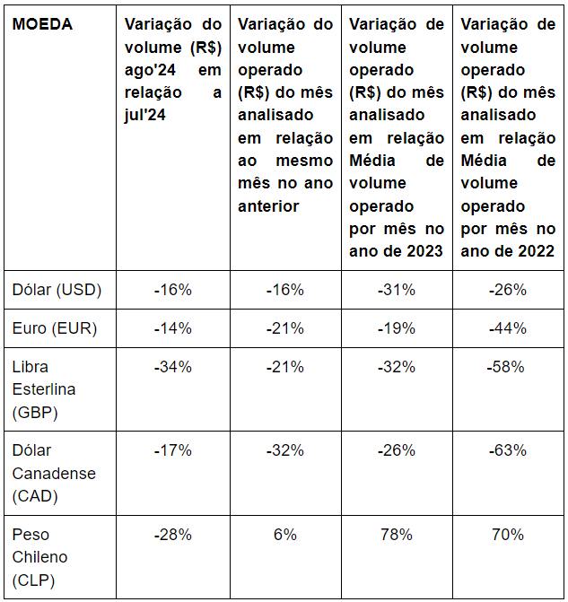 No recorte das cinco moedas mais transacionadas em agosto, todas apresentaram números negativos em relação ao mês anterior. O euro seguiu na segunda colocação do ranking, com queda no comparativo com julho de 2024 (-14%) e com agosto de 2023 (-21%). A moeda da União Europeia também apresentou queda de 19%, em relação ao volume médio transacionado em 2023 e de 44% ante o volume médio de 2022.
