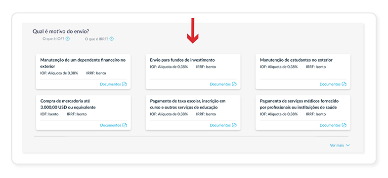 Na plataforma online da Travelex Confidence, os possíveis motivos da transação são apresentados conforme a titularidade selecionada, em um menu de fácil visualização. Para encontrar de um jeito ainda mais prático, é só usar a função de busca. Para conferir se há algum tipo de documentação a ser apresentada, basta clicar no ícone.